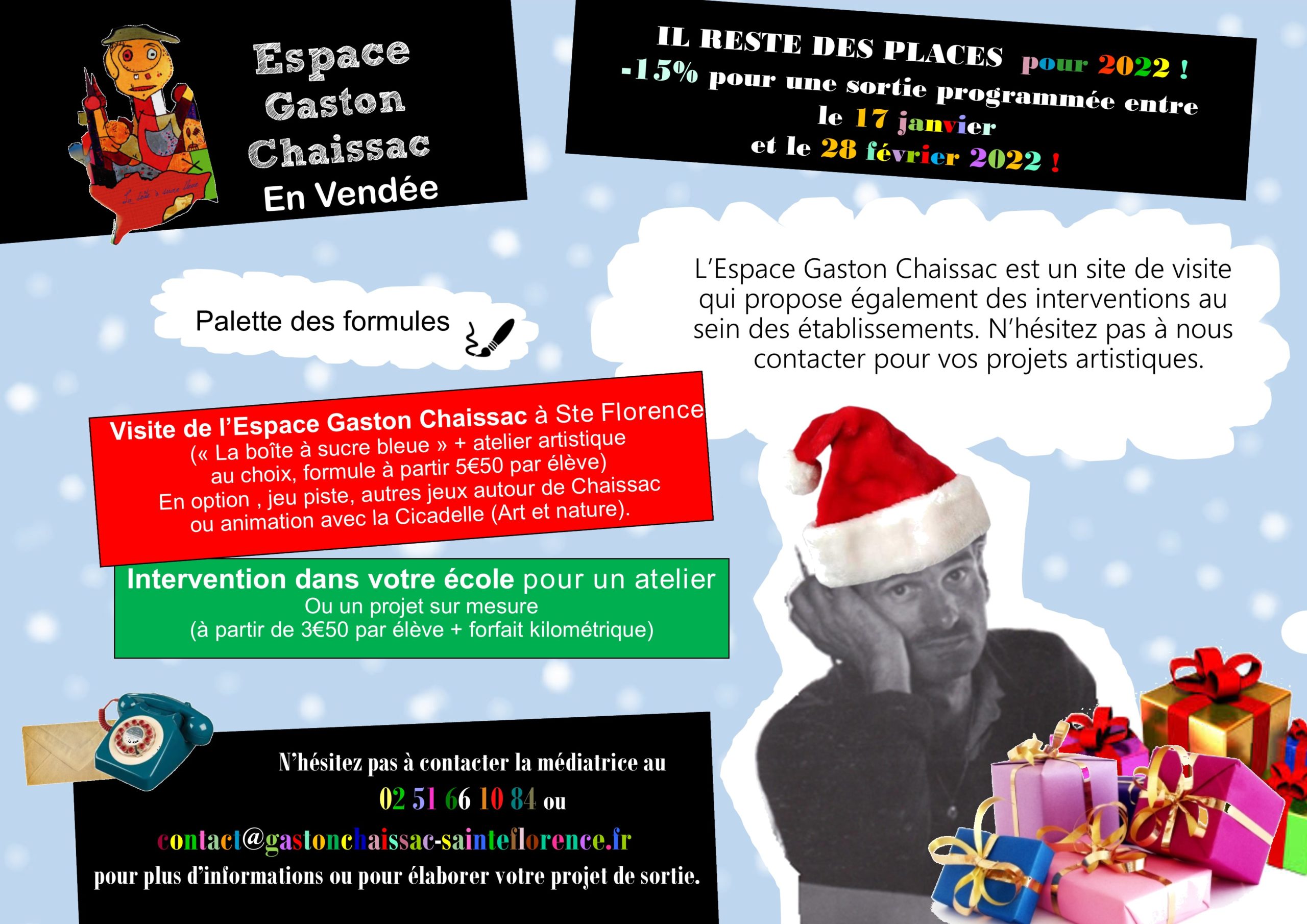 -15% sera offert aux écoles qui viennent visiter l’Espace Chaissac. Cette promotion est valable de janvier à mars 2022. Venez profiter de l’offre !